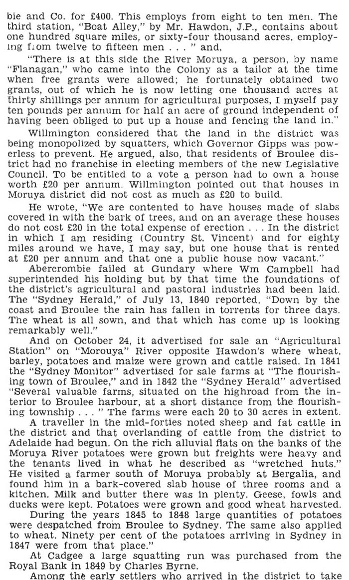 The earliest farming took place north of the Moruya River. In 1828 Francis Flanagan took up land locally, constructing his home two kilometres north of modern Moruya, at the site of Mullenderee. His ‘Shannon View’ house is pictured below.