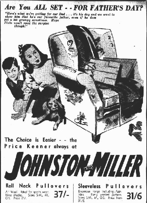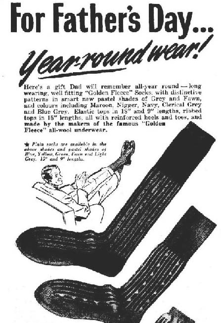 By 1951 socks were more plentiful, and obviously still a Father’s Day ‘favourite’. The advertisement certainly would not be printed today because of the word used to describe the colour black! The advertisement below featured in The Mercury, Hobart, Tasmania, Tuesday 28 August 1951