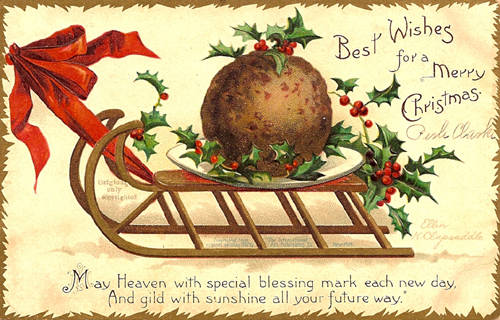 Five centuries of inspired evolution lie behind the Christmas pudding. Its primitive ancestor was plum porridge, a sweet savoury which mediaevel “barons and Stuart epicures” relished with hoar’s head, roast swan, and other realistic Yule dishes. This irresistible mixture consisted of meat broth thickened with bread and then boiled together with raisins, prunes, mace and cloves. Like the ancient mince pie, bequeathed us by the Crusaders, plum porridge fell under the Puritan Commonwealth’s ban on all Christmas cheer.