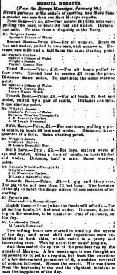 …..never perhaps in the annals of sporting has there been a greater success than our first Moruya regatta. A few weeks ago, it was thought an impossibility to get up a regatta, but from the exertions of a few determined promoters of it, a sudden reversal of opinion followed. Hence the result. Nor was there from the beginning to the end the slightest incident to mar the happiness of the day.