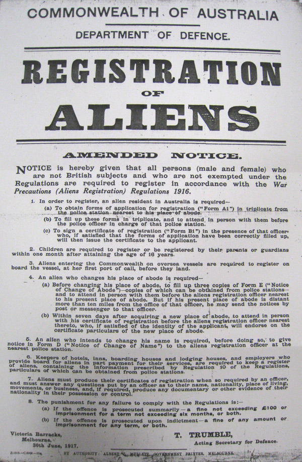 REPORT TO POLICE – Mr. Millen made the announcement on Monday that all German subjects in Australia are required to at once report to the police, and to give their names and addresses. If desiring to change their place of residence they must notify the police before leaving, and must again report on arriving at the new place of residence. All German reservists are held as prisoners of war and released on parole. 15/8/1914