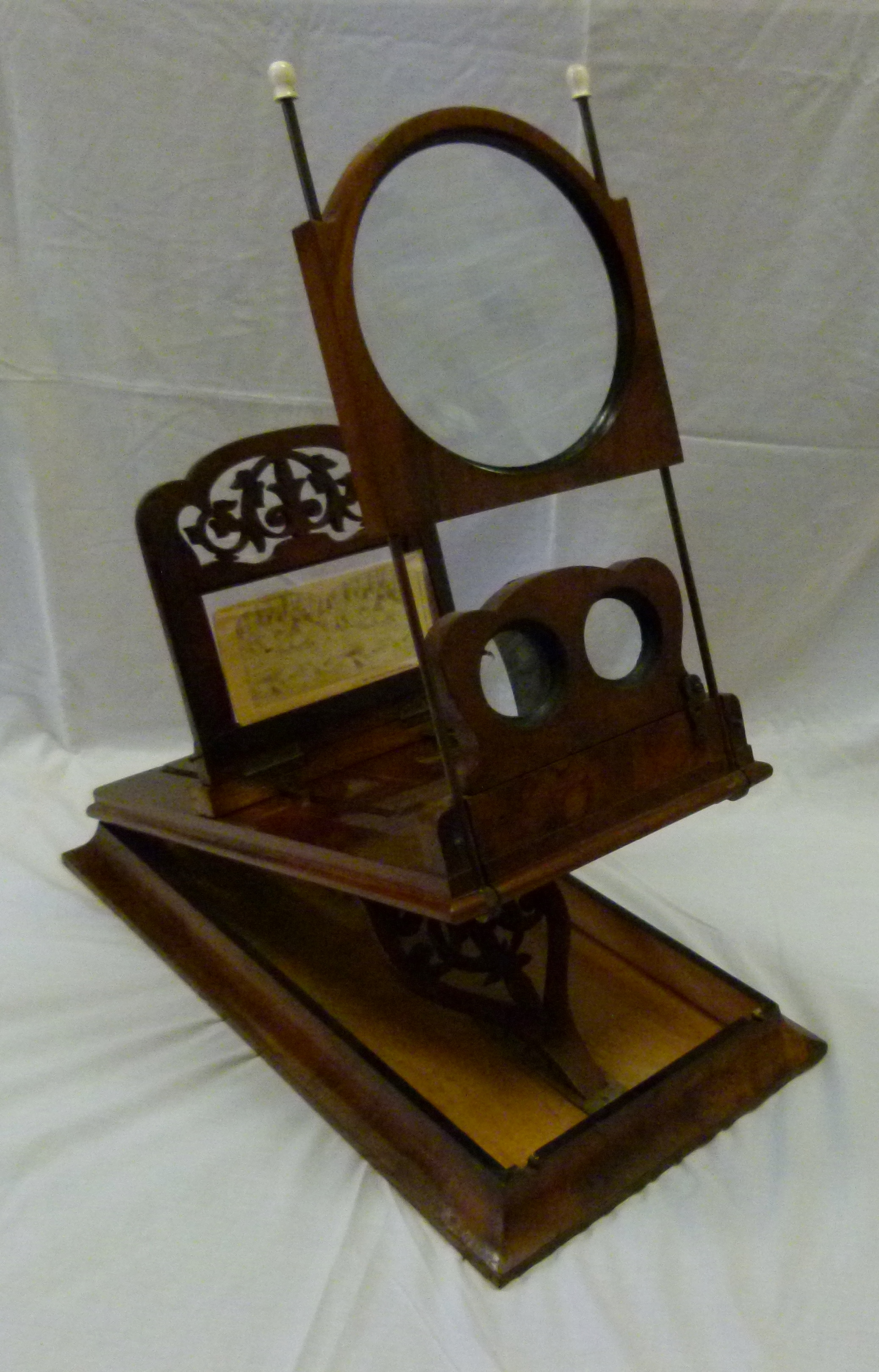 Description: In the MDHS collection we have a large table top, collapsible stereoscopic viewer made of wood with a finish in a birds-eye veneer. The viewer has three components: the base ( 15 x 30 cms) , the viewer and the easel. The viewer has a set of lenses which can be focused. Immediately behind them is a box construction which folds open when using the viewer for normal size stereoscopic cards. Above the lens is a large fixed lens used for viewing large single prints. On the easel is a shelf for large single and large stereoscopic viewers. The easel can be moved vertically and horizontally.