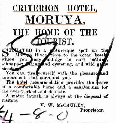 Screen Shot 2015-08-30 at 10.06.41 amLICENSING COURT – At the Licensing Court on Tuesday L. P. Lynch, Criterion Hotel, was granted a booth license for the Moruya A. and P. Society’s Ploughing Match and Sports on Wednesday next. Plans and specifications for a new building for the Adelaide Hotel were approved of. The condemnation of the building at the rear was lifted provided necessary repairs and alterations be carried out.     28 August 1915