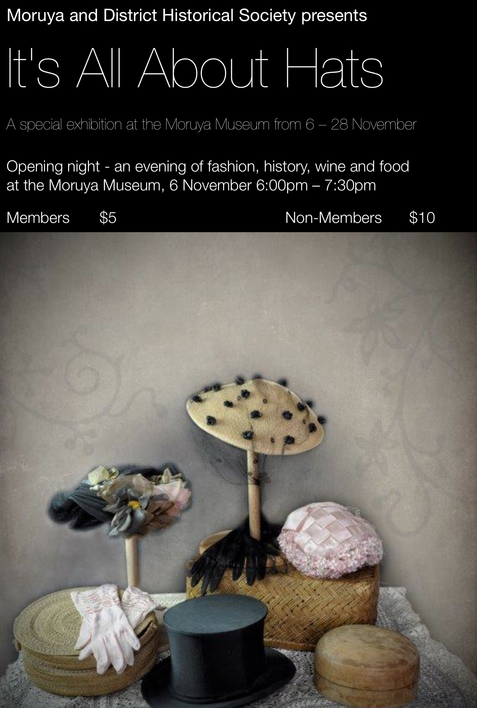 To find out the answers to these important questions and more, come along to the opening night of Moruya and District Historical Society’s exhibition It’s All About Hats on Friday, 6 November at 6pm. Look at our large collection of hats, the earliest being a velvet toque worn in 1911 as part of Mrs Ruby Newton’s going away outfit, as well as enjoying a glass of wine and some finger food.