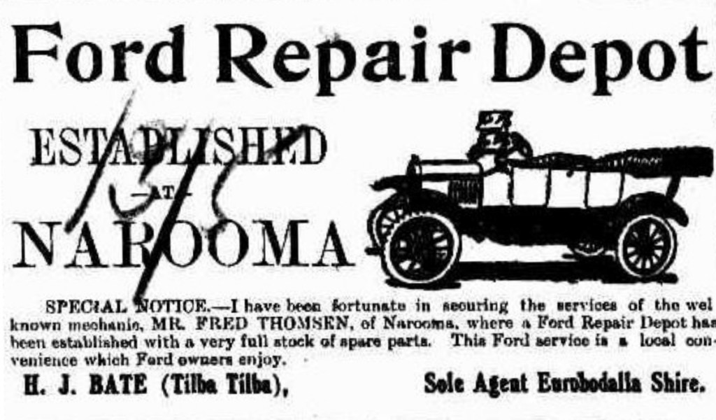 SERVICE STATION.– Special attention is drawn to Mr. H. J. Bate’s change of advertisement in this issue. Tilba’s most progressive citizen, who is sole distributor of Ford Cars in the Eurobodalla Shire, has secured the services of the well known Mechanic Mr. Fred Thomsen, to establish a Ford Service station at Narooma. These Service stations are a privilege Ford owners enjoy.