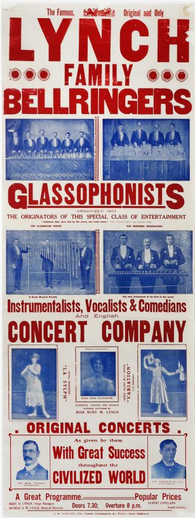 FAMOUS LYNCH FAMILY.– Once more we are to be favored with another visit of the world celebrated entertainers, the Lynch Family of Bellringers, who have just completed a tour of the whole of Queensland and New Zealand and who will appear in the Mechanics’ Hall on Thursday next, November 4th. The Handbells, Glassophone, and beautiful silver organ chimes will be heard to full advantage in operatic excerpts and new selections while the Concert Company is headed by Miss Zillah Harrison, the noted Prima Donna, Miss Irene Brunning, charming soubrette and Mr. Harry Baxter, Australia’s favorite Comedian—all artists of an unexcelled standard and well worth going a long way to see. Box plan at Weatherby’s.