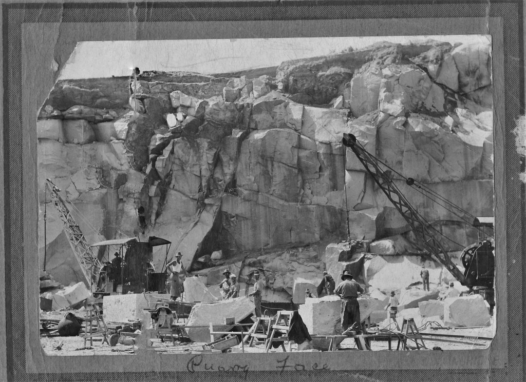 The first sod at the quarry was turned on 18th September 1924. In a few months the clearing and levelling of the site was in full swing. Soon a manager, Mr J. Gilmore, would arrive from Scotland, local men, then masons from Scotland and Italy would be employed, houses would be built for families, bachelor quarters for single men, quarters for Italians with their own cook, machinery and crushers would arrive from Sydney, sheds for workshops, machinery, would be erected, a wharf built, a railway line for transportation of the stone to ships, a whole township complete with school, post office, recreation hall would appear. The whole area became a very busy, noisy place and remained so until 1931 until the contract for the pylons of the Bridge was fulfilled.