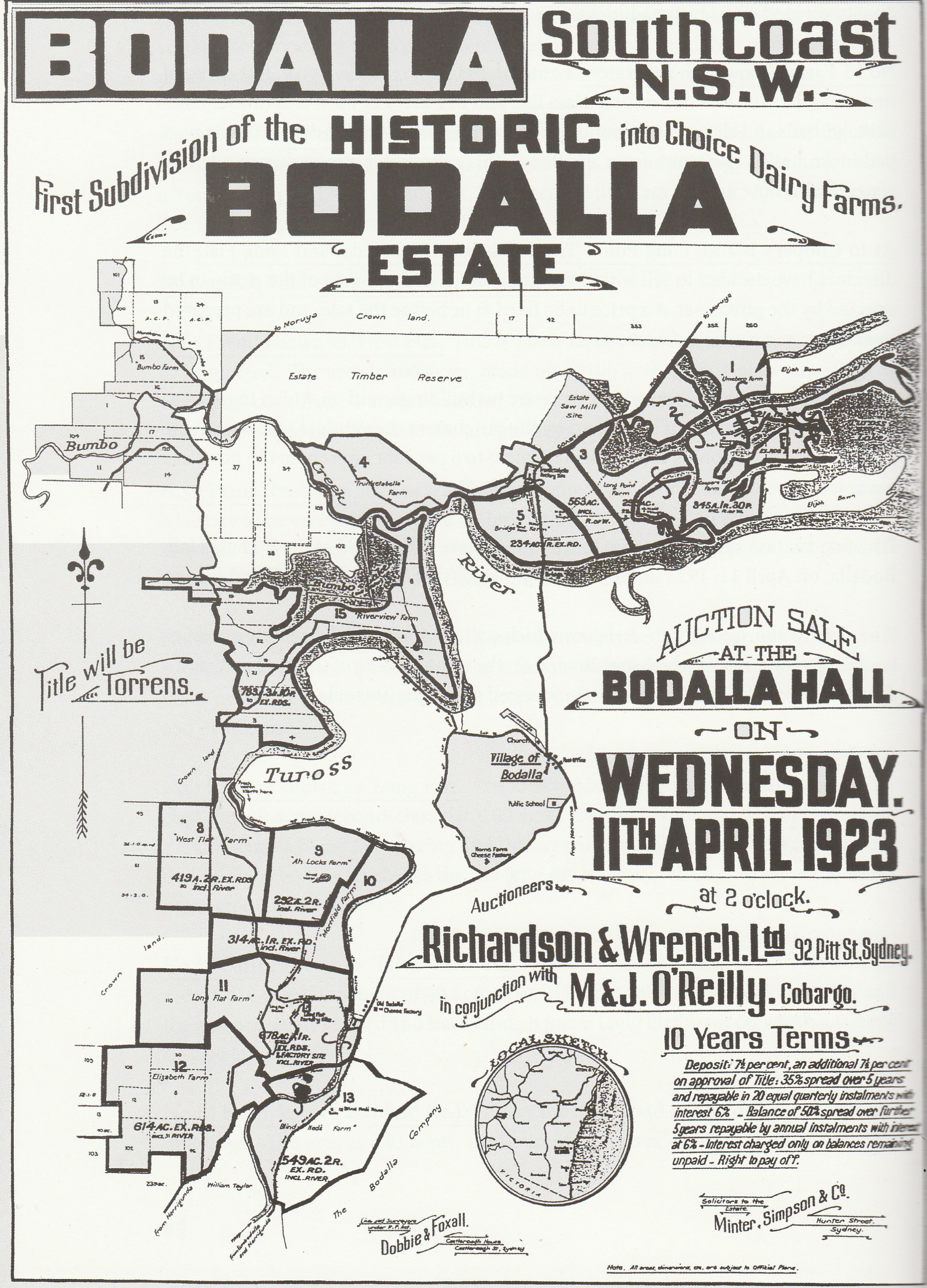 Sale of Bodalla Dairy Farms. The first subdivision sale of the Bodalla Estate was held in the hall on Wednesday afternoon. … No. 1 farm, “Umeboro,” sold to Mr. W. Cook for £3,250; No. 2 farm, “Cooper’s Island,” sold to Mr. Emmott Simpson for £5,250; No. 3 “Long Point,” was eventually secured by Mr. Clem Bate for £7,700; No. 4 farm, “Trunketabella,” was knocked down to Mr. Osborne for £6,400; No. 5, “Bridge Farm,” was also secured by Mr. Osbourne for £5,000. No. 8 farm, known as “West Flat,” no offer was received; No. 9 farm, “Ah Locks,” was passed in at £2,700; No. 10 farm, “Mortfield,” sold privately to Mr. Willington, Hornsby, for £3,000; Farm No. 11, “Long Flat,” afterwards sold to Mr. Kay for £5,250; No offer was received for No. 12, “Elizabeth Farm; No.13 farm, “Blind Ned’s,” was sold to Mr. Stewart for £4,900; “Riverview Farm” was afterwards sold to Mr. Abraham Emmott for £4,500. The remaining farms have for the present been withdrawn from sale.