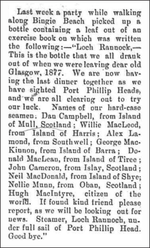 In January 1925, the Moruya Examiner reported an extraordinary find: a bottle containing a message had washed ashore on Bingie Beach, just south of Moruya. The note, written 48 years earlier in 1877 by sailors aboard the Loch Rannoch, described their final dinner as they approached Port Phillip Bay and listed the names of nine crew members.