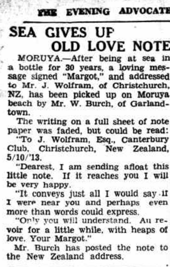In February 1943, a remarkable discovery was made on beach near Moruya. Mr W. Birch of Garland-town found a bottle washed ashore, carrying a love letter that had drifted at sea for 30 years. Amid the turmoil of the Second World War, the tale captured the public’s imagination and was published in newspapers across Australia and New Zealand.
