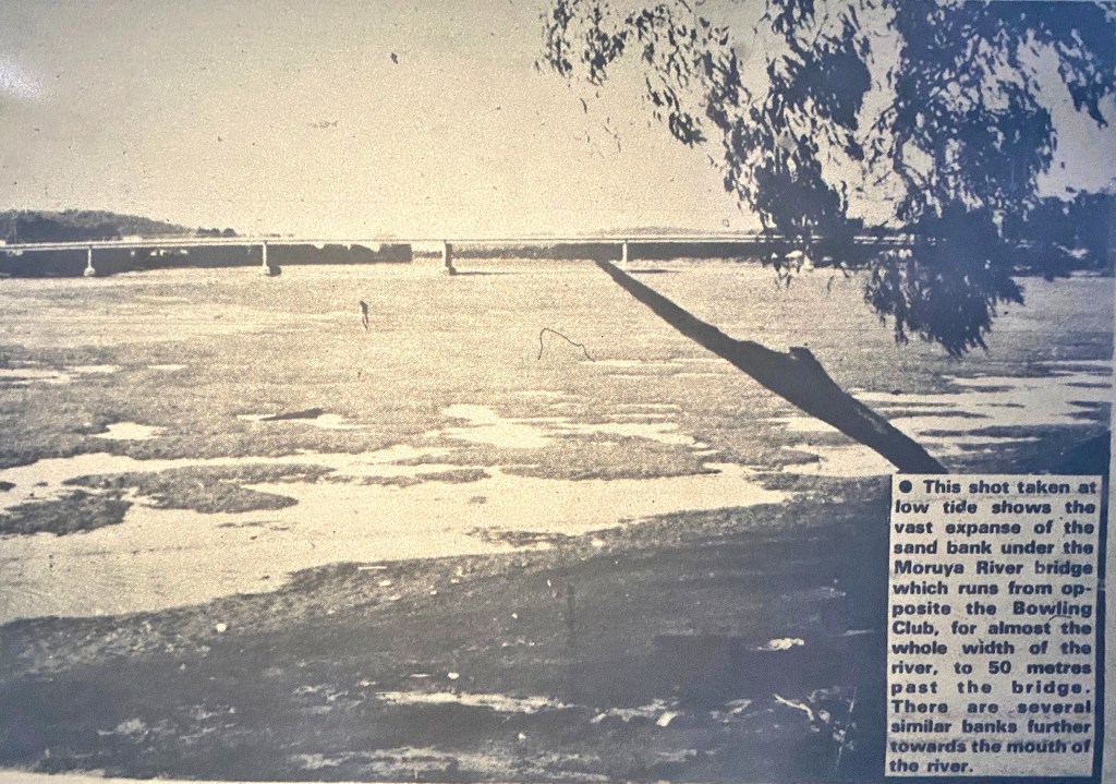 Ironically, the incident occurred the day after the men had attended a special meeting to decide what action to take to try and have the river dredged from the bridge to the sea as a matter of urgency. President of the Moruya Chamber of Commerce, Mr. Jim Rodgers, said the situation was not just choking the river, but the town drain. “The river drains the town, the flats and the basin,” he said. The local Fisherman’s Club is also concerned that unless dredging is carried out, it is only a matter of time before a fatality could occur on the bar. A committee was formed to take action.