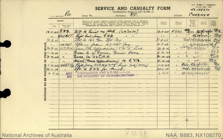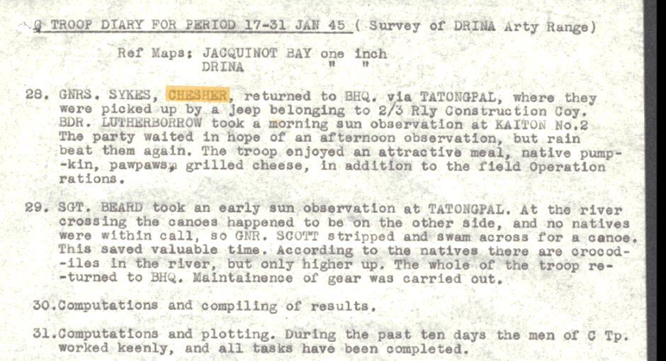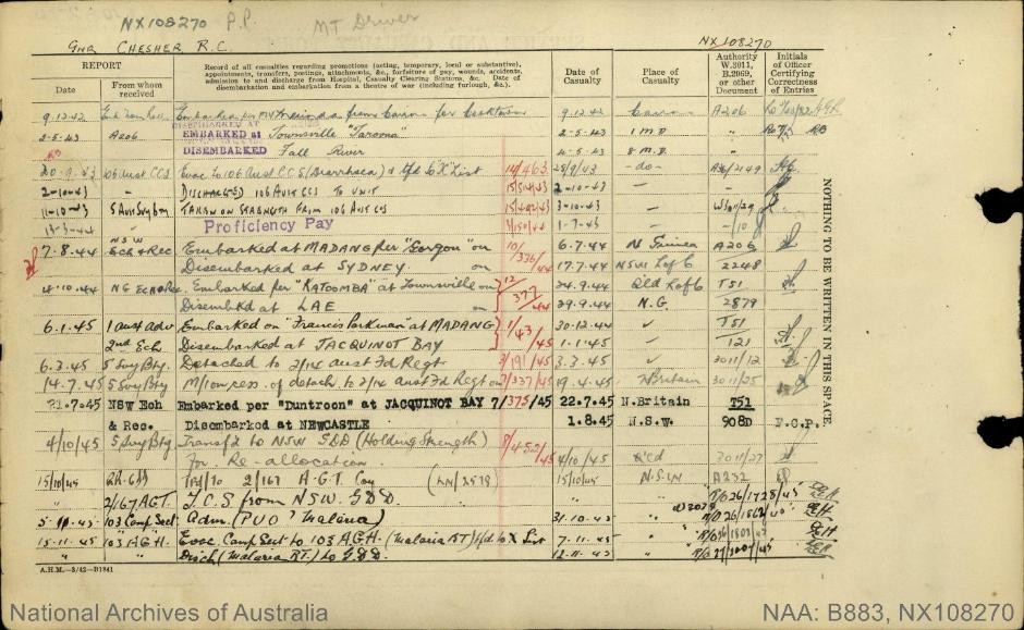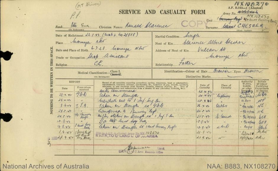 Ronald Chesher was 19 years old when he enlisted in the Army in WWII. At the time of enlistment he was working in his father’s grocery story in Moruya.
