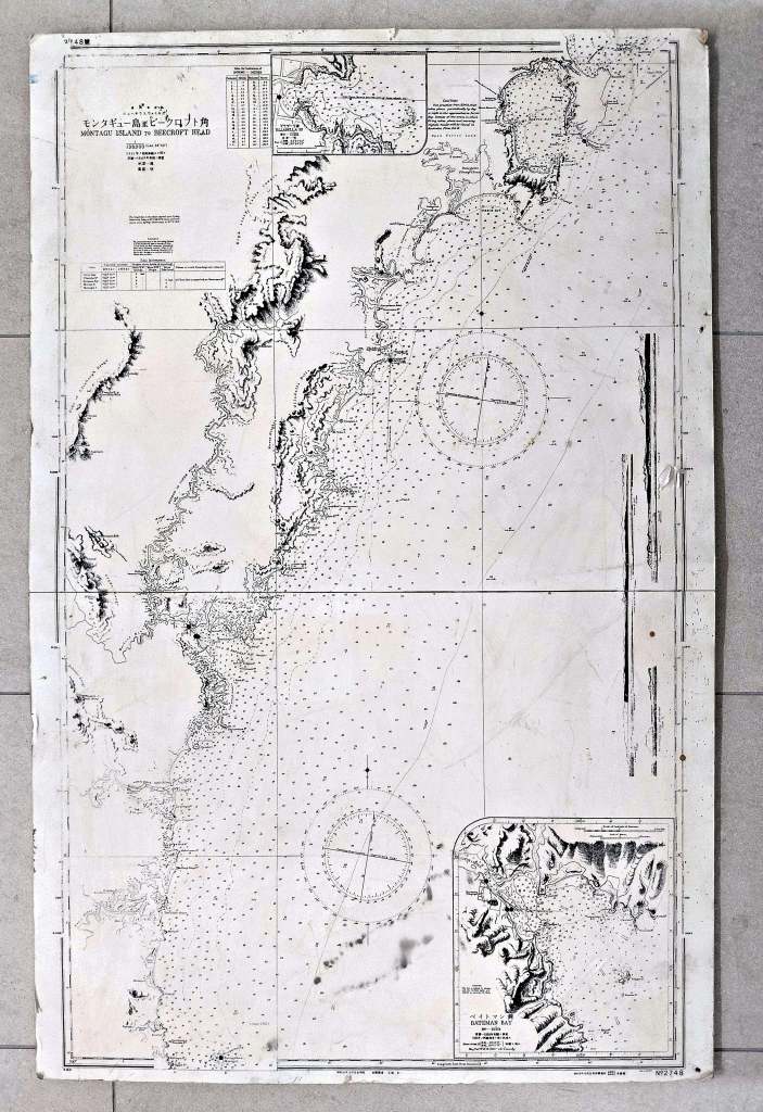 The original map was produced by the British Admiralty as part of a detailed series mapping the Australian coastline with ocean depths. At some point during the Second World War, the Japanese acquired one of these charts and reproduced it, adding their own headings and annotations.