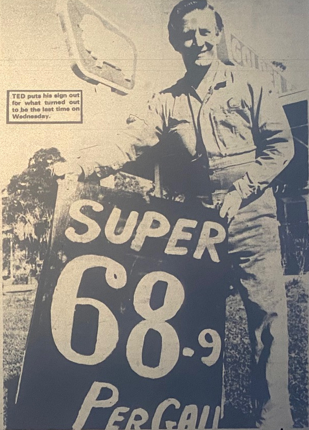 Mr. Ted Briggs of the Golden Fleece station reduced the price of his petrol to 68.9 cents a gallon [15.16 cents per L] on Tuesday morning. He knocked 10 cents off a gallon as a protest against depot trading under which certain sections of the community get discount petrol. He claims that if all petrol was sold through normal retail outlets then the price for everyone could be reduced. His aim is to get the oil companies to remove petrol pumps from the depots.