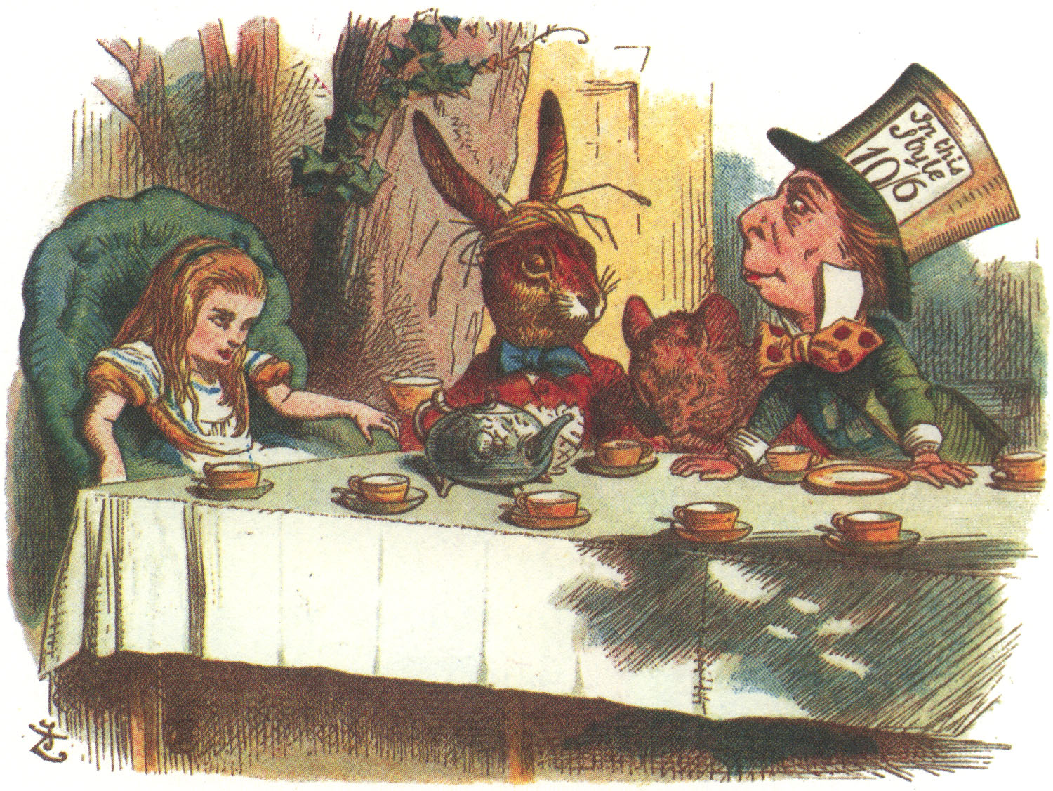 ”Take some more tea,’ the March Hare said to Alice, very earnestly. ‘I’ve had nothing yet,’ Alice replied in an offended tone, ‘so I can’t take more.’ ‘You mean you can’t take LESS,’ said the Hatter: ‘it’s very easy to take MORE than nothing.’